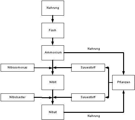 Stickstoff wird hauptsächlich durch Futter ins AQ eingebracht. Fische bauen die Eiweiße im Körper um, verwenden einiges zum Aufbau der Zellen und scheiden einen großen Teil davon in Form Ammonium/Ammoniak über die Kiemen und den Kot wieder aus.
