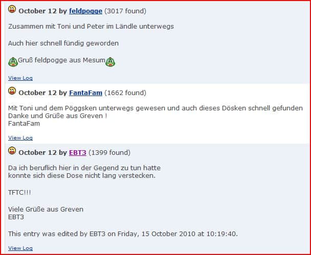 Heute waren wir cachen und fanden doch tatsächlich bei einem Cache eben diese 3 Cacher mit ihren elektronischen Logs, aber im Logbuch waren diese ebenso nicht zu finden.