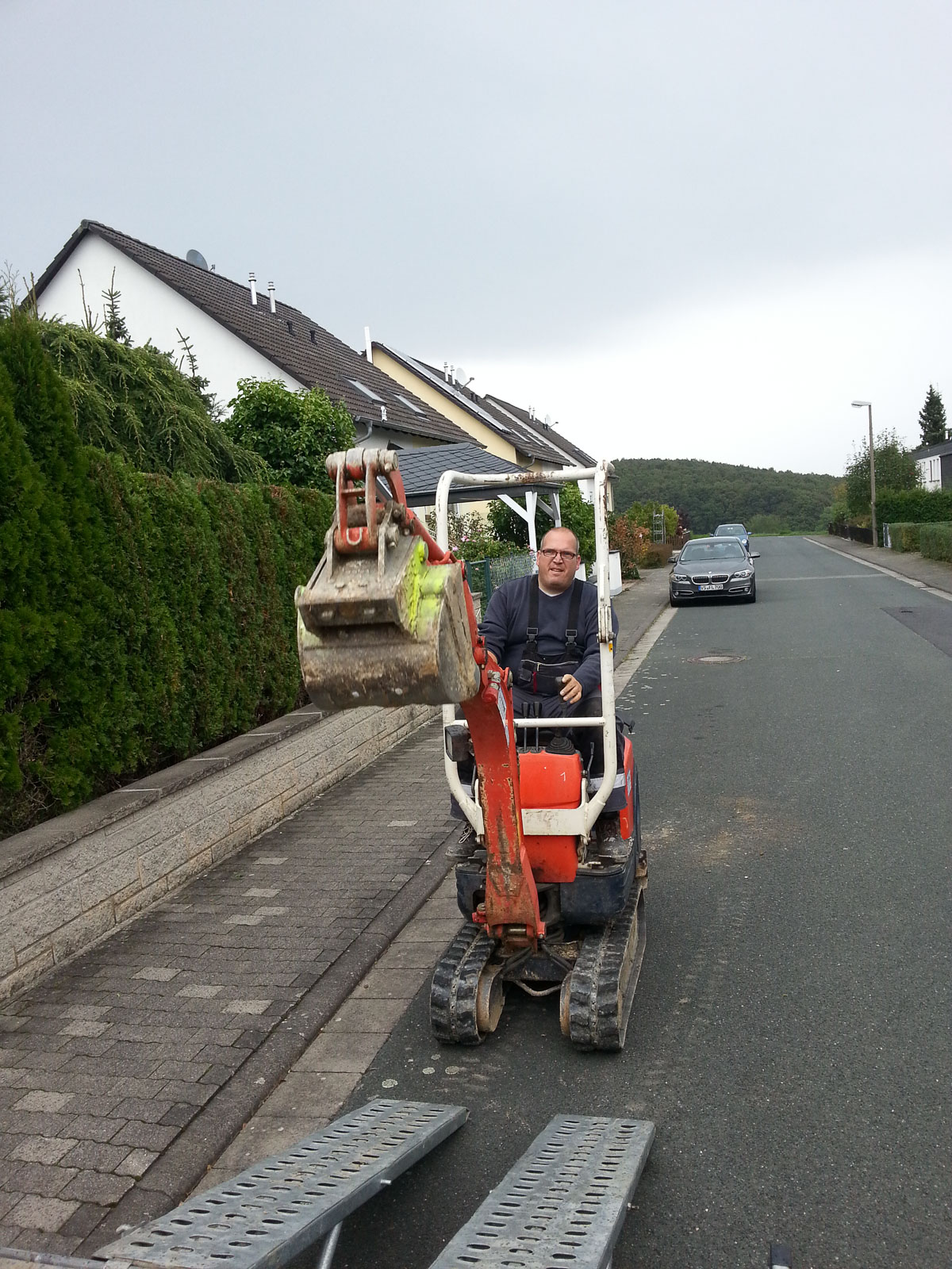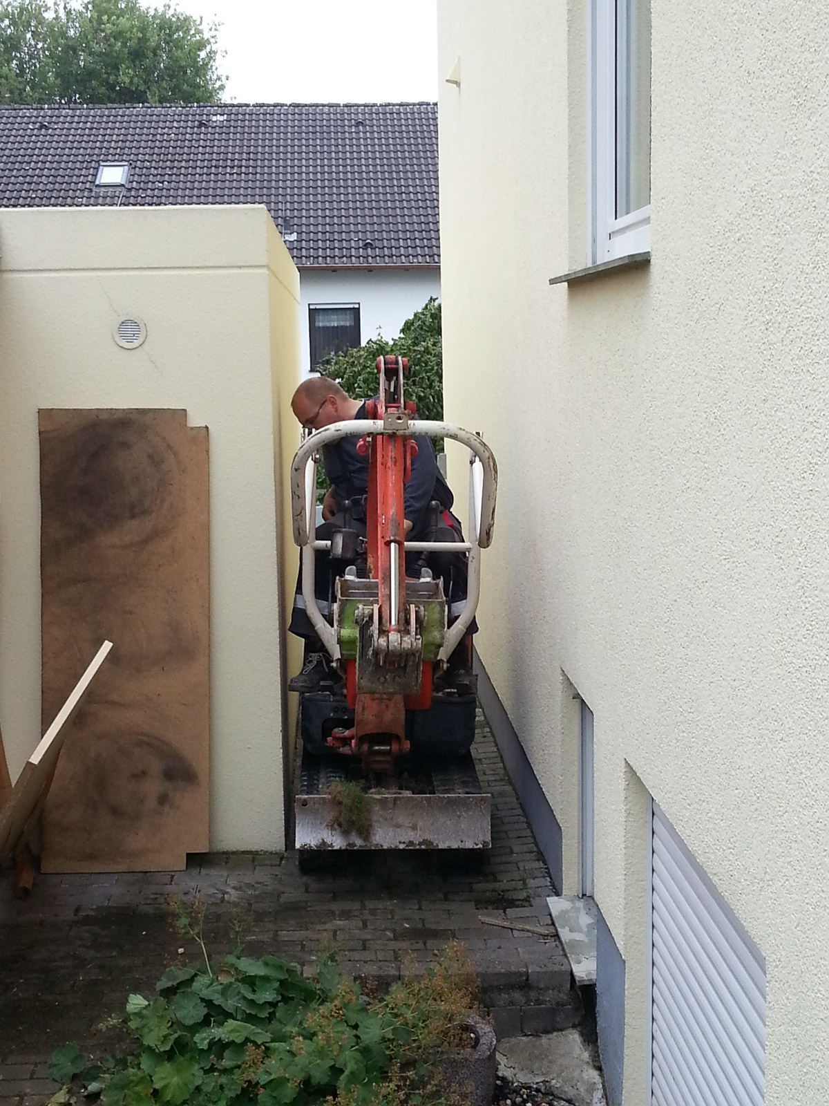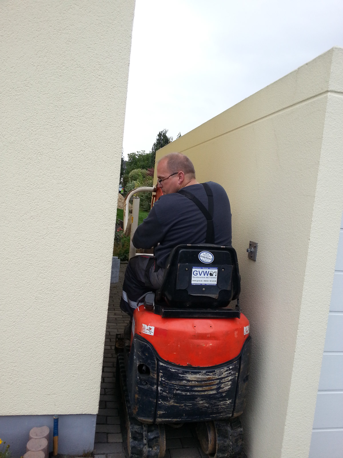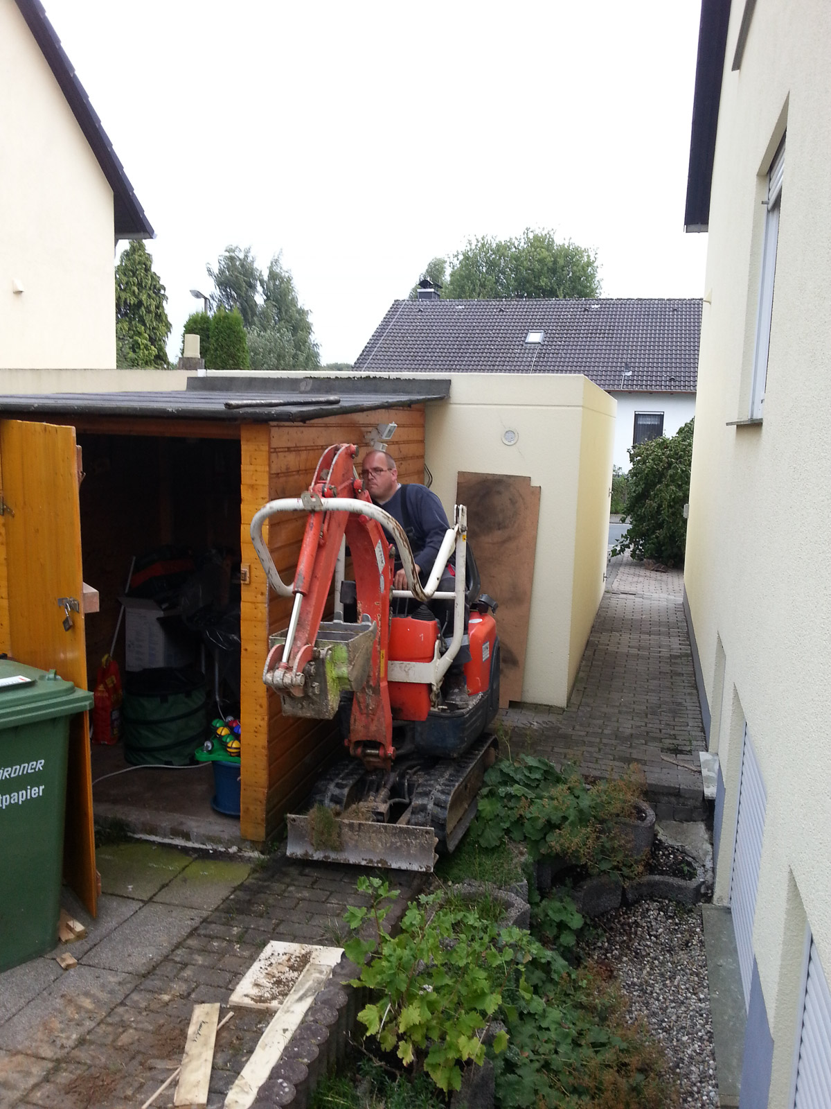 Die Herausforderung bestand ja darin einen Bagger zu finden, der zwischen meiner Garage und dem Haus durchpasste – und da war wahrlich nicht viel Platz. Aber diese vermeintliche Engstelle war nicht die wirkliche Herausforderung, denn ein Stück weiter wurde es nochmal deutlich enger, aber das könnt ihr nachher in den Bildern sehen.
