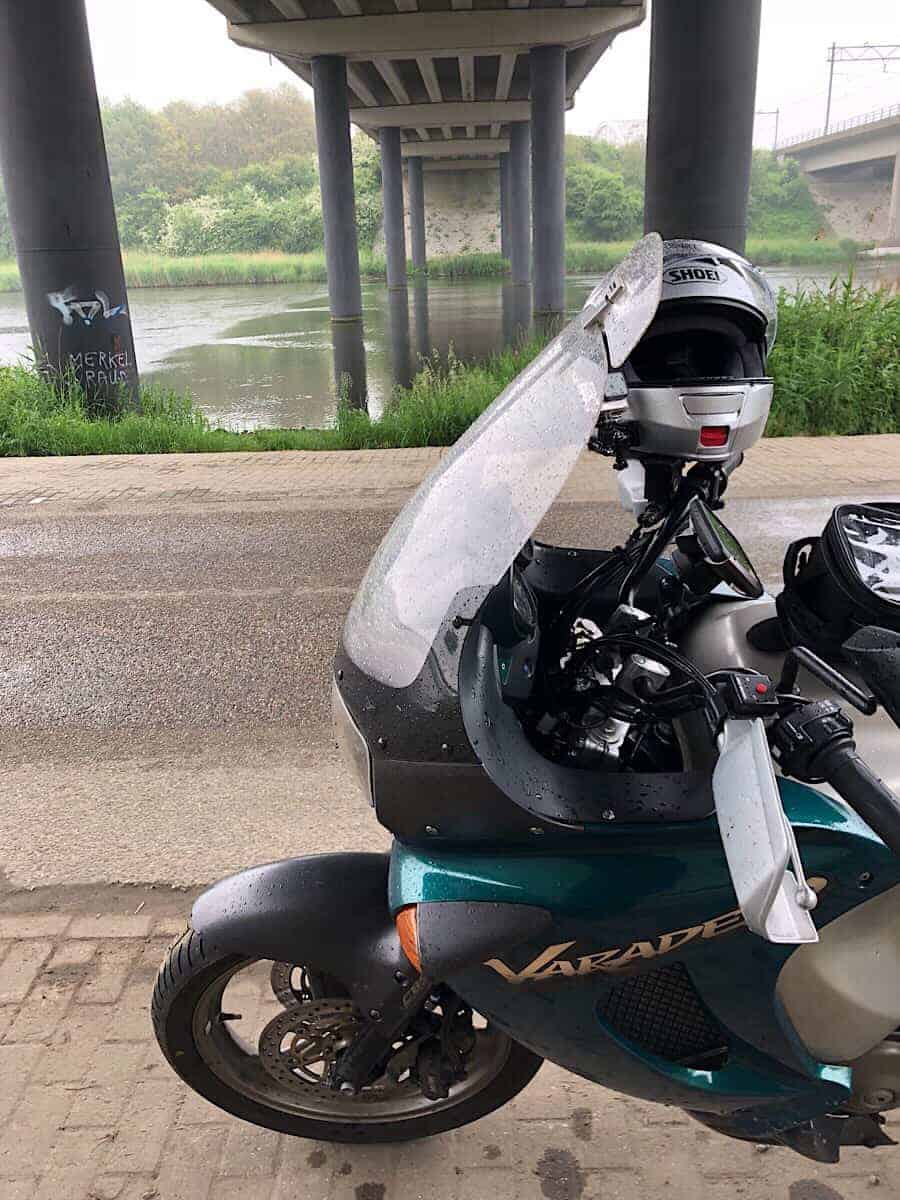 Trotz des schlechten Wetter starteten wir in Richtung Strand. Auf dem Weg dorthin fuhren wir den Deich entlang, und fanden eine Stelle, die für ein Foto mit Motorrad und zum Muschel suchen geeignet war.