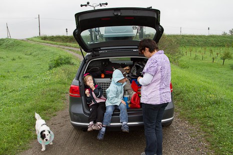 5 Minuten später als geplant starteten wir um 4:05 Uhr in der früh Richtung Italien. Der Kofferraum war dank Dachbox und Fahrradträger auf dem Dach angenehm gefüllt, so dass wir immer beim Verlassen vom Auto immer die Hutablage schließen konnten und so neugierige Blicke vom Inhalt fernhalten konnten. Neben der Hundebox inkl. Bonta hatten wir noch 2-3 Rucksäcke im Kofferraum und 2 Behälter, der Rest war in der Dachbox.