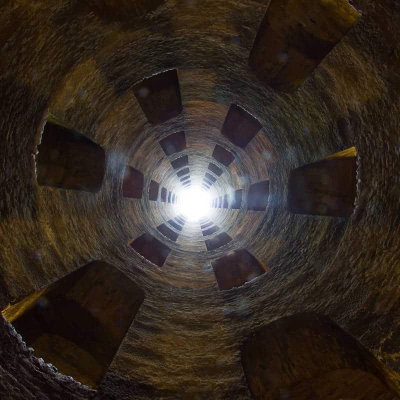 Ich bin gerade beim Bilder sichten und da ist mir folgende Aufnahme in die Finger gefallen, die ich am Boden des Brunnens nach oben gemacht habe – leider kein Stativ dabei, aber ein Geländer tat es auch, um bei knapp 4 Sekunden Belichtung ein halbwegs erklärendes Bild hinzubekommen.